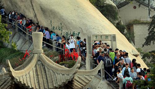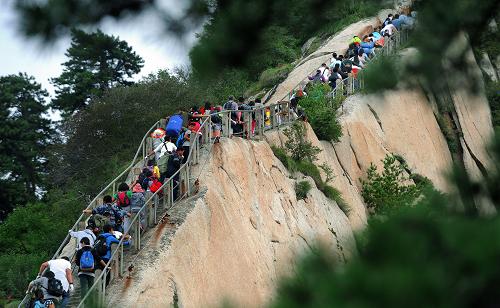 游客通过华山风景区北峰的擦耳崖(10月3日摄)。10月3日,陕西省华山风景区游客达38841人,景区内虽然人山人海,却秩序井然。近年来,华山风景区全面提升景区设施,开通了西峰索道,形成全景区的上下大循环;拓宽、改造21条5100米山上道路,并新增16条4000多米辅路,改变了“华山自古一条路”的格局;新建31处4000多平方米的观景平台,使华山的接待能力由原先不足2万人上升到6万人。新华社记者 陶明 摄