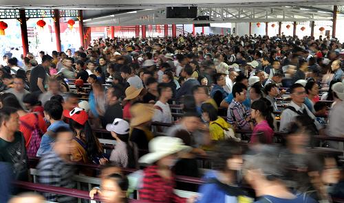 游客们排队等待乘坐索道下山(10月3日摄)。新华社记者 陶明 摄