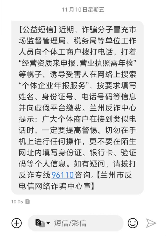 有企业反映,称收到落款为“工商管理”“市场监管”的短信,短信内容大致为提醒企业营业执照被列入经营异常或者未报送年报,提示企业登录短信内的网址进行处理,不然就要停止使用、销户。工作人员打开短信内网址链接发现网站内需要企业填写身份证、银行卡、联系方式等信息,这些信息一旦填写,不法分子极易通过银行快捷支付功能盗刷卡内资金。