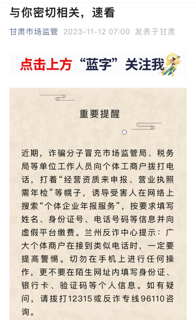 1、各企业主、个体工商户如收到以“市场监督管理局”名义发来的,要求登录不明网站认证企业经营信息的短信,请一定提高警惕,可先通过官方渠道向有关部门确认。