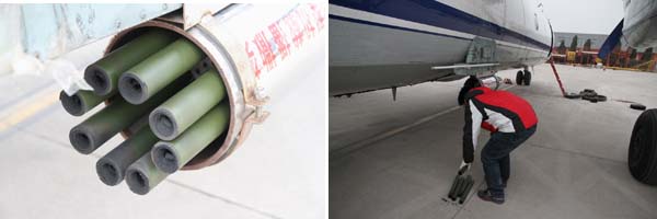 组图1:人影飞机装载催化剂烟条,准备启程。