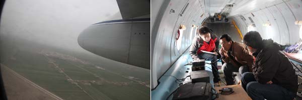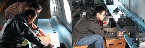 组图2:飞机飞往河北上空;工作人员记录数据并与人影办指挥中心保持联系。
