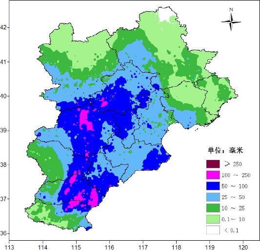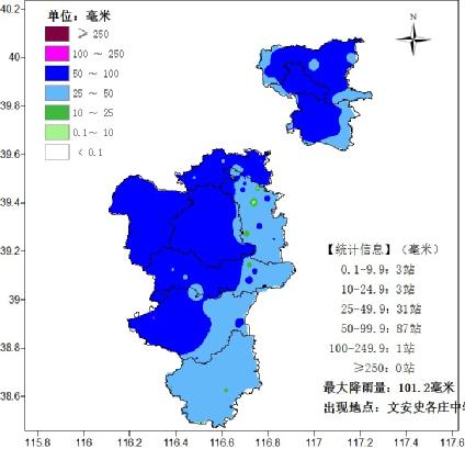 雄安平均降雨量50.3毫米,最大降雨101.2毫米,出现在雄县米家务。最大小时降雨量45毫米,出现在雄县北沙口。