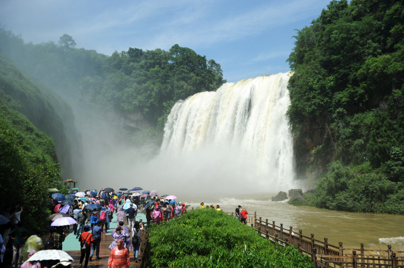 游客在贵州安顺市黄果树瀑布景区游览(2018年6月5日摄)。