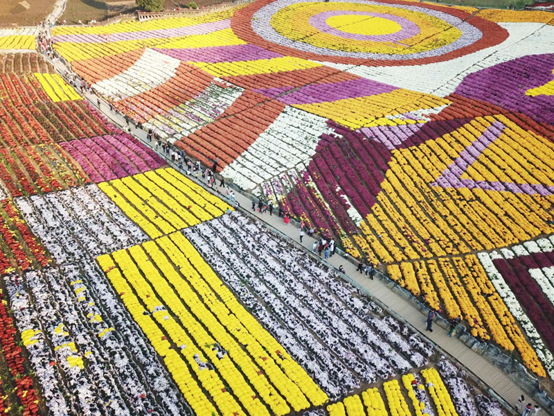 游客在贵州麻江县宣威镇药谷江村的菊花基地里赏菊(2018年11月3日无人机拍摄)。