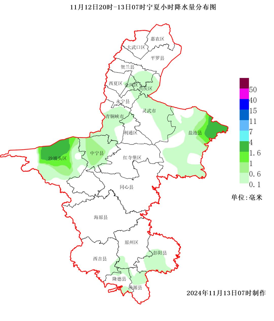 12日前半夜,全区阴,银川市金凤区、兴庆区、灵武市东部、盐池县、青铜峡北部、彭阳县、隆德县、泾源县出现小雨或阵雨(0.1~2.7毫米);后半夜,沙坡头区、中宁县、青铜峡市阴转小雨或阵雨(0.1~2.1毫米),其他地区阴;
