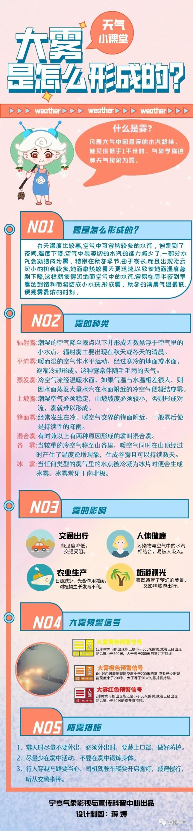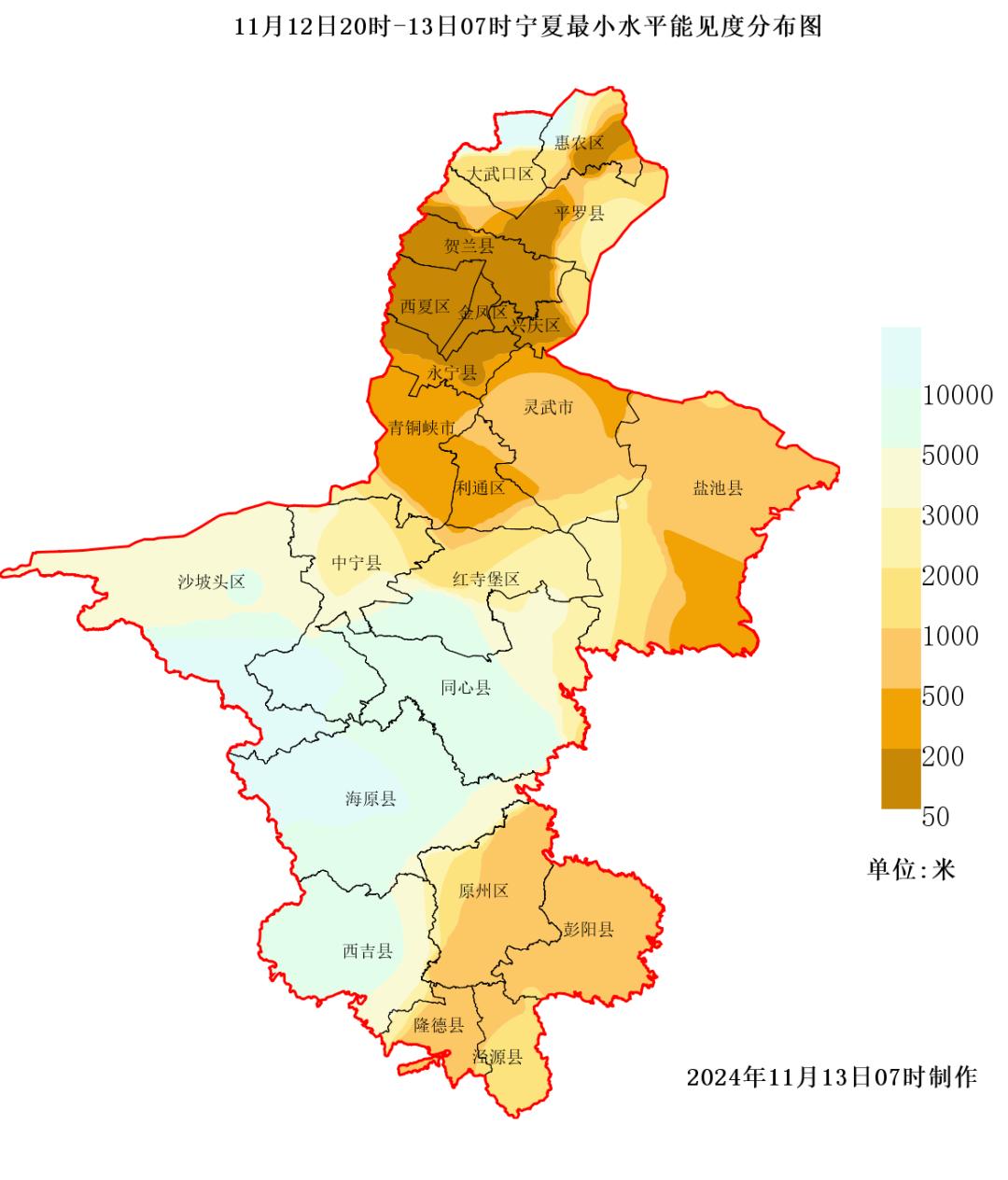 全区普遍出现雾或轻雾(0.1~8千米),其中,银川站、平罗站、惠农站、贺兰站为强浓雾,永宁站、吴忠站、青铜峡站为浓雾,固原站、盐池站、灵武站、隆德站、彭阳站为大雾,其他地区为轻雾,最小能见度出现在银川站为70米。
