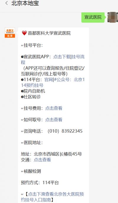 温馨提示:微信搜索公众号【北京本地宝】,关注后回复【宣武医院】获北京宣武医院预约挂号平台入口(114/APP)、挂号流程/怎么取号/挂号费、检查报告查询/互联网诊疗/住院登记等。