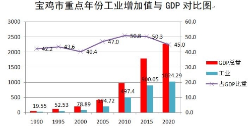 百年来,随着工业总量规模不断壮大,产品日益丰富,工业主导地位逐步确立。1990年,宝鸡市实现工业增加值仅19.55亿元,占GDP的比重为42.2%,2020年,宝鸡市实现工业增加值1024.29亿元,是1990年的52.4倍,年平均增长13.6%,占GDP的比重也提高到45%,工业引领地位全面确立。图二