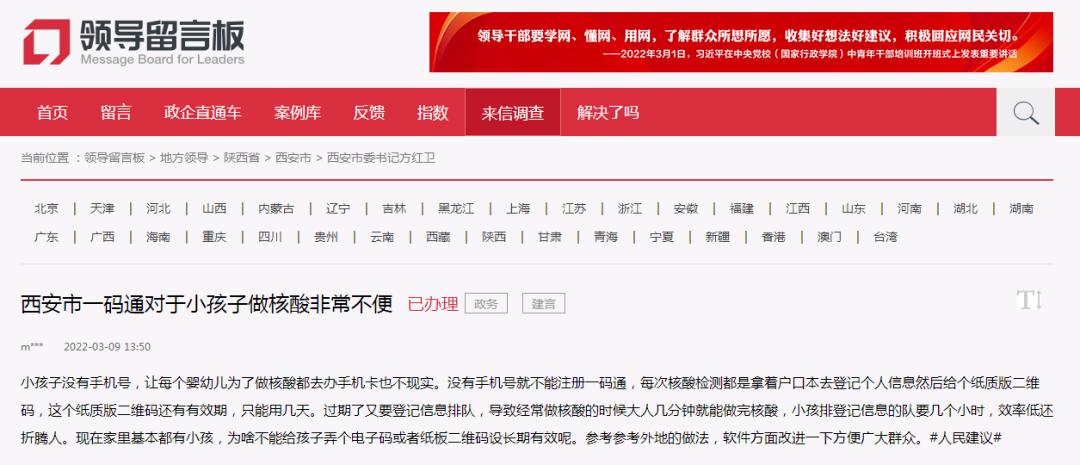 日前,有网友表示,西安市一码通对于小孩子做核酸检测非常不便,希望孩子也有一个电子二维码。