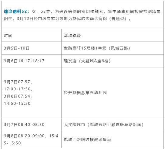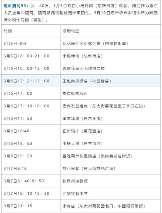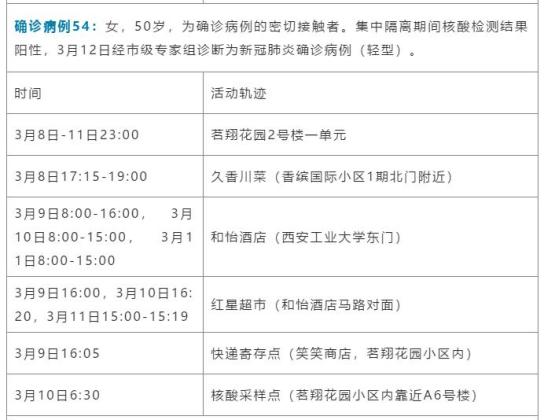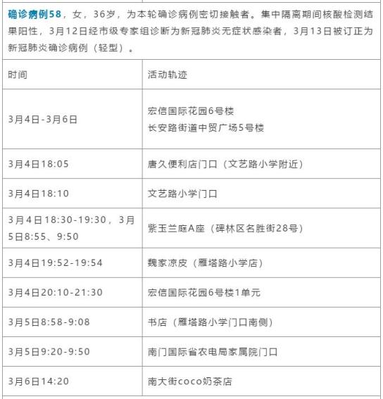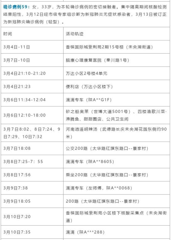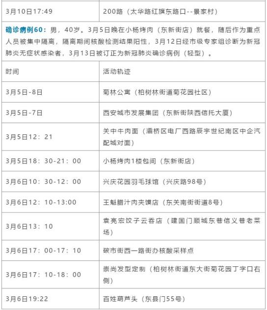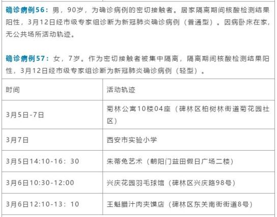 根据流调情况,3月12日0时-24时西安市新增6例本土确诊病例(3例普通型、3例轻型)、3例本土无症状感染者(3月13日均转归为确诊病例,轻型),8例集中隔离发现,1例居家隔离发现,经流行病学调查,均与既往病例存在流行病学关联,现将主要活动轨迹公布如下(未公布的时间段尚未发现有公共场所活动轨迹):