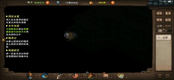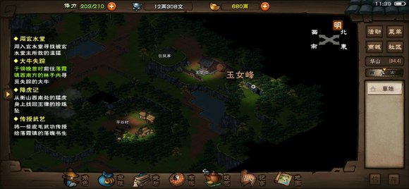 华山玉女峰有个隐藏的洞,WIKI上没有写,不知道大家有没有找到,华山(34,4),进去之后有上下两层,下面没看见有什么东西,山洞(2,27)雁九可以去上层,这里正好火折子没了,将就着看吧,然后上层有两个箱子,一个位置没记住拿了就没了,地方不大很容易找,还有一个在山洞(16,0),然后山洞里(5,1)还有一个洞,进去是一间房间,里面没看见什么东西,不知道是有剧情还是就是一个探索元素