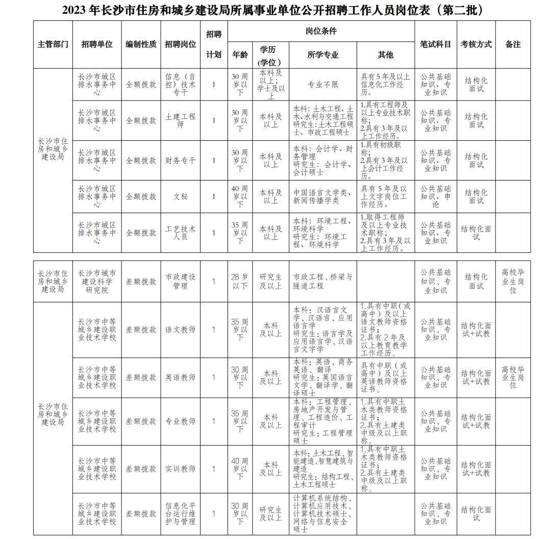 1.2023年长沙市住房和城乡建设局所属事业单位公开招聘工作人员岗位表(第二批)