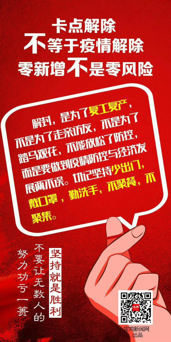 宝鸡市中医医院感染疾病科主任刘兴介绍,经过前期的努力,新冠肺炎疫情得到了有效防控,全社会付出了巨大的努力,近期撤销了市域内联合检查点,但不是宣告疫情防控工作结束,更不是让大家走亲访友,而是为了复工复产,保障市民正常生产生活秩序。希望广大市民明白,虽然最近十余天宝鸡没有新增新冠肺炎确诊病例,但并不代表我们周围绝对没有病毒传播的可能性。天气转暖,正值各种病原微生物易于生长繁殖和作祟之际,加之早春的气候多变,冷暖莫测,每当人体抵抗力减弱或对外界环境适应性欠佳的时候,各种疾病也就悄然而至。春季很容易发生流行性感冒、流脑、麻疹等呼吸道传染病,市民一定要重视防病保健,勤洗手、多通风、戴口罩、不聚餐,科学预防,保障自身和家人身体健康。