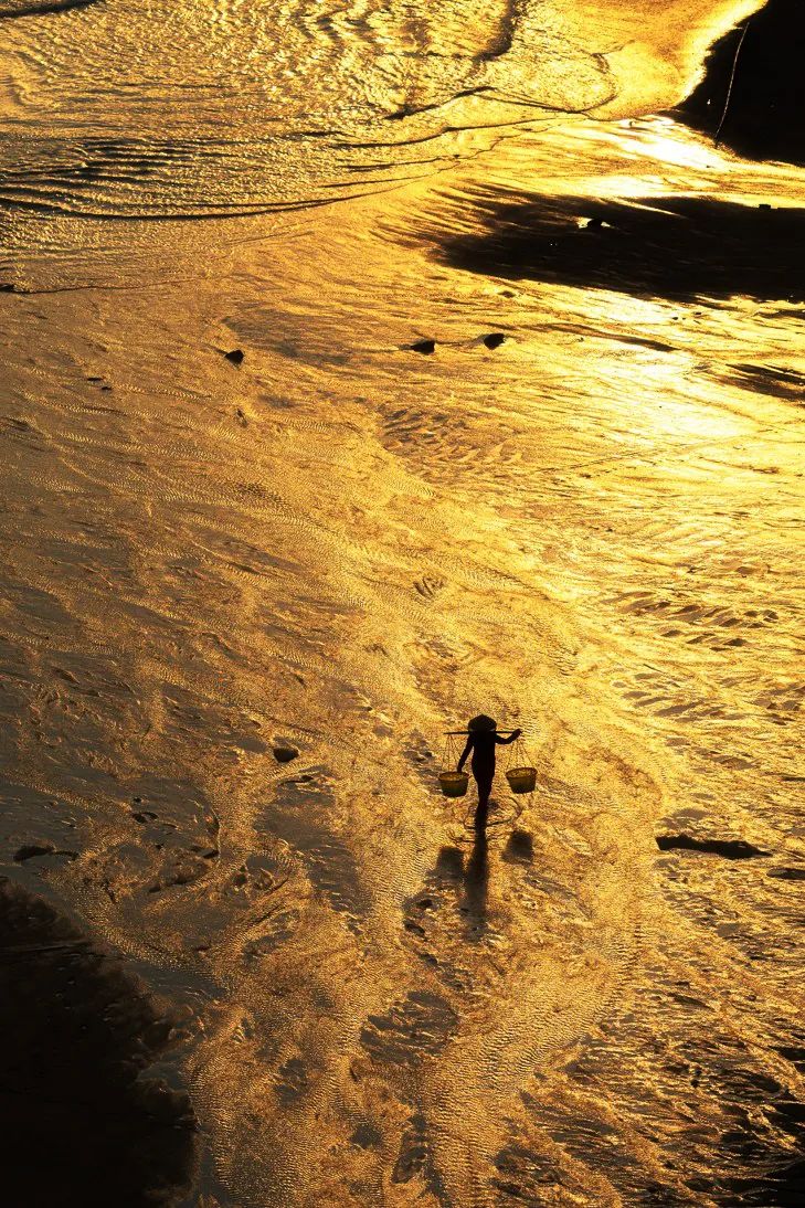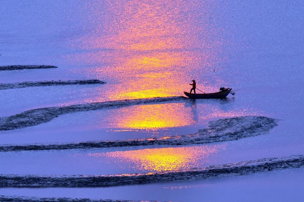 日出日落的滩涂之上,金光随波而变。到了秋季,渔民们会在这里拉竿挂绳,养护收割,满滩满海的人影船影,等的就是这一年的收成。