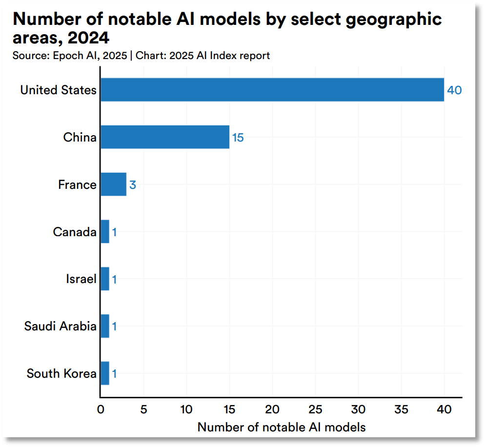 近日,由李飞飞联合领导的斯坦福大学以人为本人工智能研究所(Stanford HAI)发布《2025年人工智能指数报告》(Artificial Intelligence Index Report 2025)。报告指出,中国高性能AI模型的数量和质量不断提升,中美AI模型性能近乎持平。与此同时,中国在AI领域论文数量和专利数量上保持领先地位。