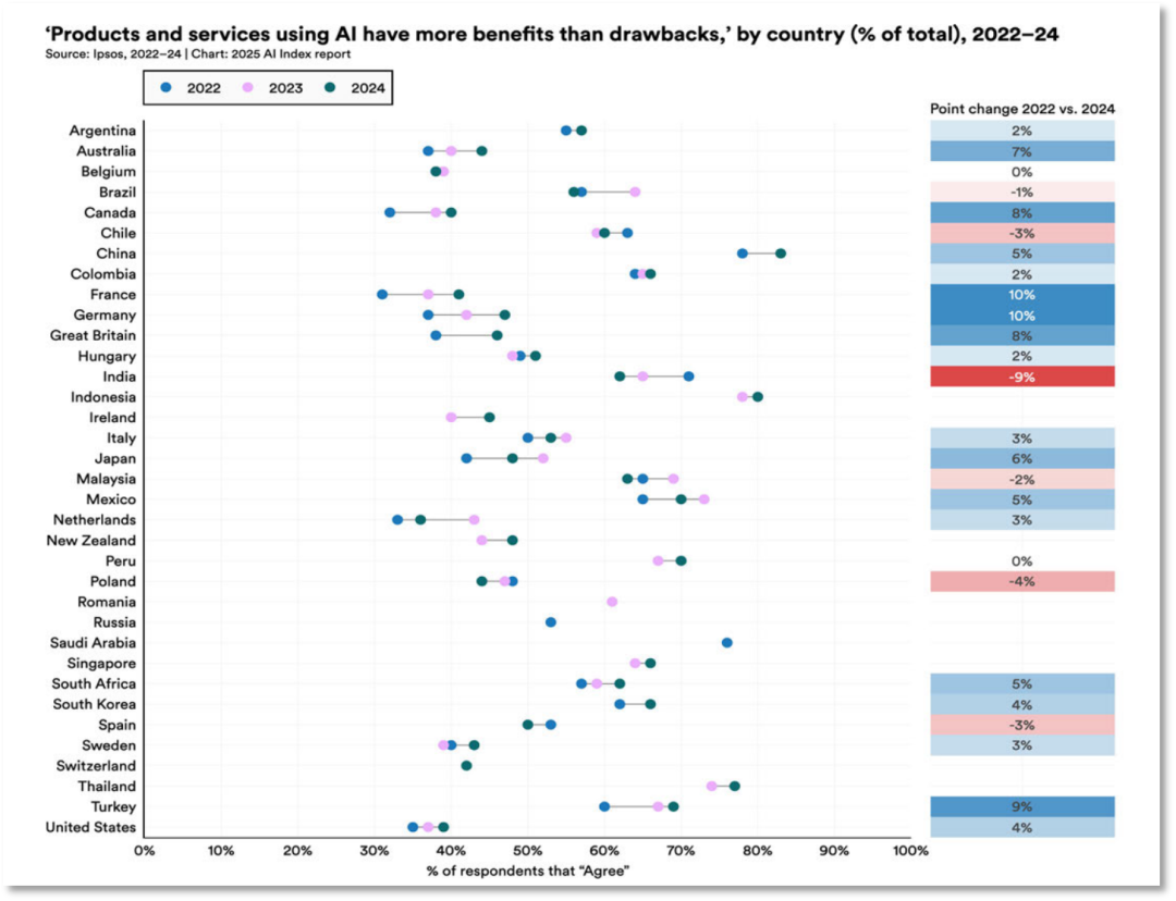 在对AI的态度方面,中国是全球主要国家和地区中最乐观的。报告显示,2024年中国有83%的人认为AI产品和服务利大于弊,排在后面的是印度尼西亚(80%)和泰国(77%)。相比之下,美国(39%)、加拿大(40%)等的乐观情绪远低于中国。