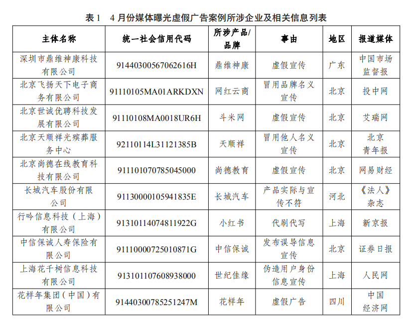 2019年4月,共归集媒体披露的虚假广告相关案例11件,涉及企业主体10个。从事件发生地区来看,主要集中在北京和上海,以上两地企业数量分别占总数的50%和20%(见表1)。