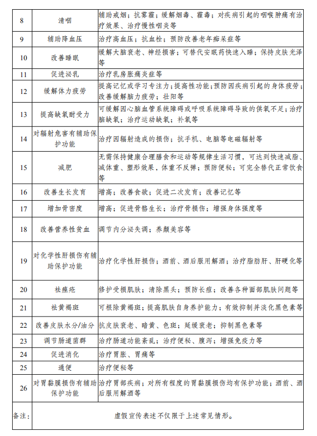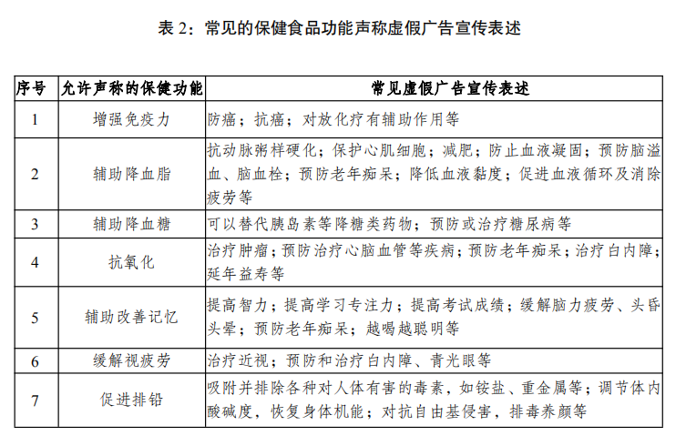 三是警惕保健食品虚假广告常用关键词。保健食品不能宣称具有治疗疾病的功能,虚假广告中出现夸大产品功效的类似词语时要提高警惕。法律法规允许保健食品声称的保健功能及其对应的常见虚假广告宣传表述见表2。