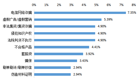 从失信行为类型看,4月份失信案例主要涉及电信网络诈骗(7.35%)、虚假宣传/虚假广告(5.39%)、非法集资/集资诈骗(4.90%)、侵犯知识产权(4.90%)、法院判决不执行(4.90%)、不合格产品(4.41%)、套路贷(3.92%)、骗保(3.43%)、刷单刷评/刷单炒信(2.94%)、伪造材料证明(2.94%)等行为(见图2)。