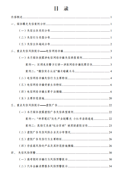 近期广大考生即将进行高考。同时,据有关媒体预测,汽车类消费即将成为市场关注热点。本报告建议公众注意并提前防范高考期间可能高发的替考、销售虚假答案、谎称可帮助录取、仿冒正规大学等各类诈骗行为和汽车金融消费服务相关失信行为风险。