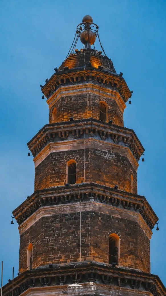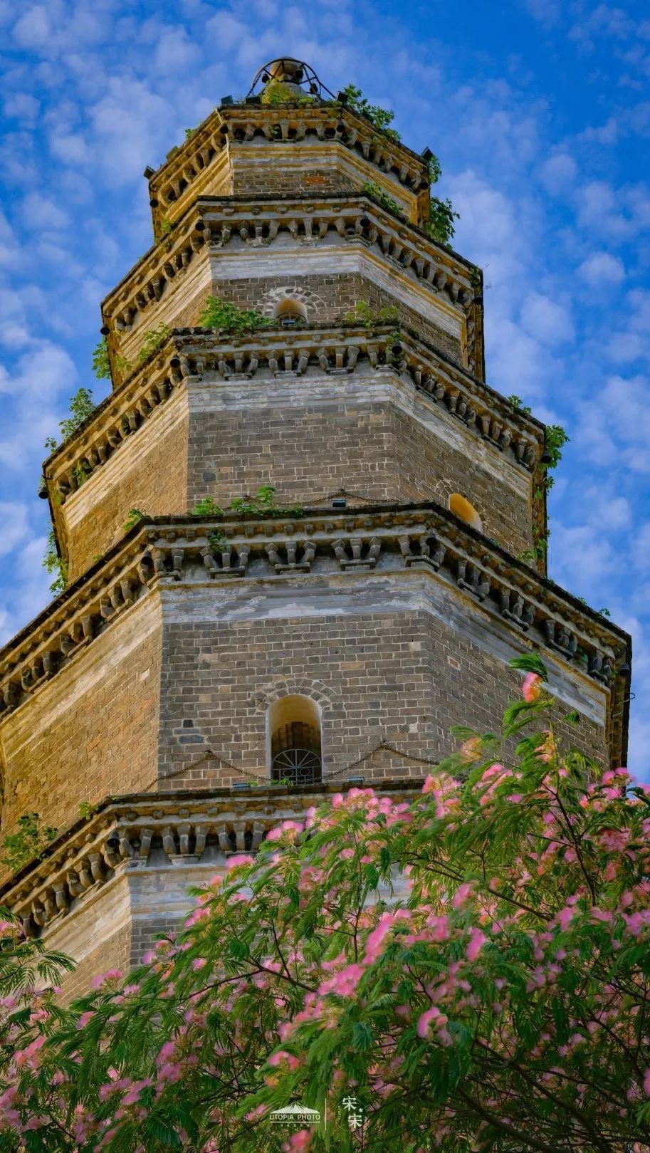 每当朝阳初起时,塔光山影倒映江面,宛如一条巨型钢鞭,压在五龙之上,因而又有“鞭打五龙”之称。