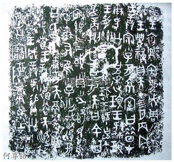 何尊铭文大意是成王五年四月,周王开始在成周营建都城,对武王进行丰福之祭。周王于丙戌日在京宫大室中对宗族小子何进行训诰,内容讲到何的先父公氏追随文王,文王受上天大命统治天下。武王灭商后则告祭于天,以此地作为天下的中心,统治民众。周王赏赐何贝30 朋,何因此作尊,以作纪念。