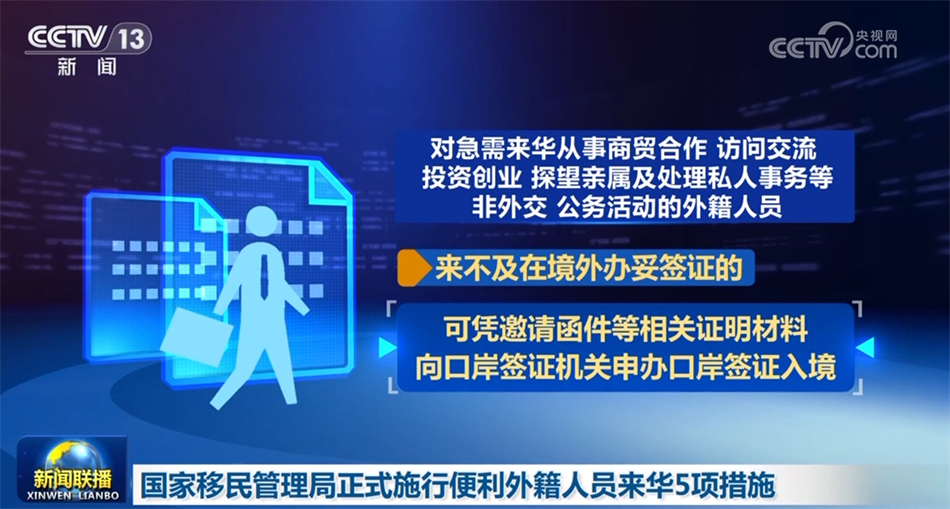 5项新举措主要包括:放宽来华外籍人员申办口岸签证条件。对急需来华从事商贸合作、访问交流、投资创业、探望亲属及处理私人事务等非外交、公务活动的外籍人员,来不及在境外办妥签证的,可凭邀请函件等相关证明材料向口岸签证机关申办口岸签证入境。