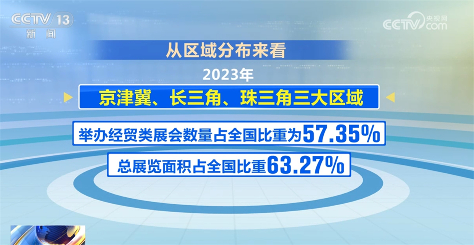 从区域分布来看,2023年京津冀、长三角、珠三角三大区域举办经贸类展会数量占全国比重为57.35%,总展览面积占全国比重63.27%。