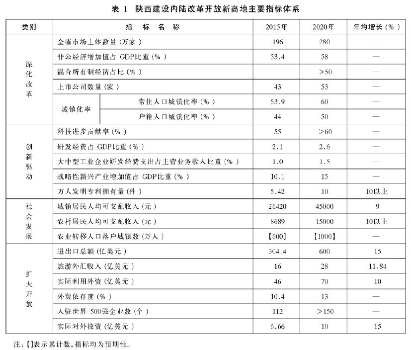到2020年,陕西在区域发展中的辐射和带动作用进一步增强,促进内陆地区融合发展和服务全国改革开放的作用更加明显。市场配置资源的决定性作用充分发挥,供给侧结构性改革取得明显突破,行政审批事项大幅缩减,基本形成与开放型市场经济相适应的政府管理制度。市场主体活力不断增强,国企改革走在西部地区前列,非公经济增加值占GDP比重达到58%,形成服务实体经济发展的金融开放创新制度。高效的开放型体制机制基本构建,外商直接投资和对外投资年均增长10%和15%,进出口总额突破600亿美元,经济外向度达到15%以上,外贸依存度提高约3个百分点左右。将中国(陕西)自贸试验区建成全面改革开放试验田、内陆型改革开放新高地、“一带一路”经济合作和人文交流重要支点,形成宽领域、多层次、高水平的全面开放新格局。产业转型升级迈上新台阶,创新驱动发展走在全国前列,战略性新兴产业占比达到15%,服务业增加值占比达到45%,科技成果转化能力进一步提升,研发经费投入强度达到2.6%,科技进步贡献率达到60%以上。人民生活水平和质量进一步提升,城乡居民人均可支配收入力争赶上全国平均水平,县域经济活力持续增强,新型城市群竞争力显著提高,脱贫攻坚任务全面完成。生态环境质量总体改善,宜居环境更加美好,民主法治建设持续加强,陕西经济社会发展的质量和效益内陆领先,走在内陆改革开放前沿,成为引领和带动内陆地区发展的新高地。