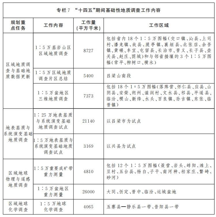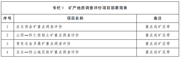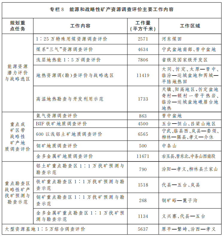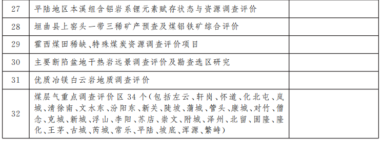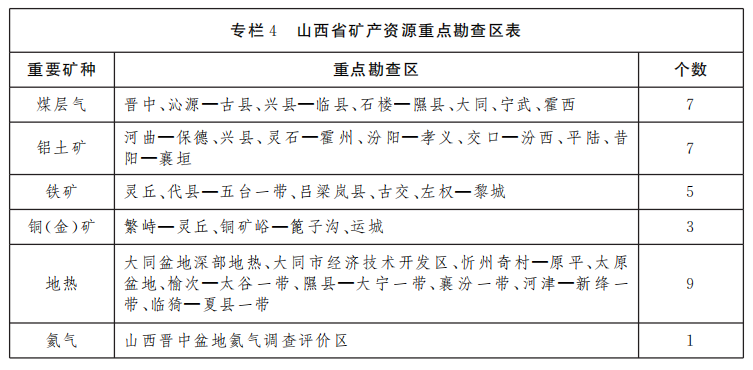 以全省重要成矿区(带)为重点,重点开展煤层气、铝土矿、铁矿、铜(金)矿、地热、氦气勘查工作,规划重点勘查区32个,其中煤层气7个、铝土矿7个、铁矿5个、铜(金)矿3个、地热9个、氦气1个。