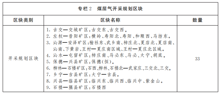 1.落实7个国家规划矿区。重点建设沁水—屯留、左权—昔阳、沁源—安泽、古交—交城、保德—兴县、柳林—石楼、乡宁—吉县等7个国家规划矿区,打造新型现代化资源高效开发示范区,加大优质资源的规模开发利用,支撑煤层气产业化基地建设。