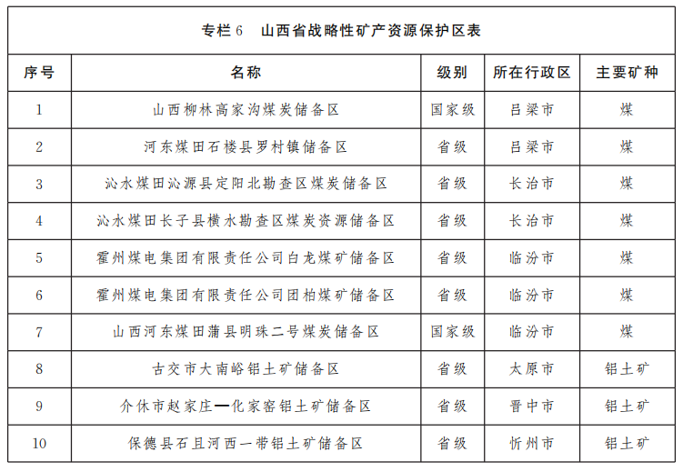 划定10个战略性矿产资源保护区,涉及煤炭、铝土矿2个矿种