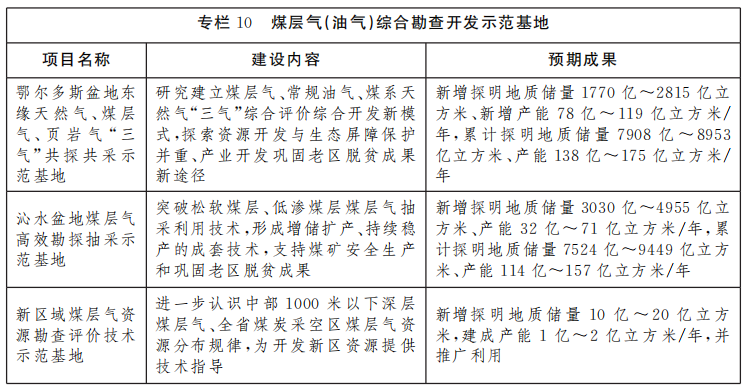 煤层气基地建设:紧密围绕能源革命综合改革试点任务,统筹协调资源开发利用与生态文明建设,推动煤层气等非常规天然气高质量发展,加快先进开采技术研发应用,增加煤层气消纳能力,大力推进沁水盆地、鄂尔多斯盆地东缘两大基地建设,产能力争达到200亿~250亿立方米,着力打造煤层气先进装备制造业基地及京津冀后备清洁能源供应基地,成为国家级新能源示范基地,切实为黄河流域生态保护和高质量发展提供绿色发展样本,积极助推山西高质量发展。