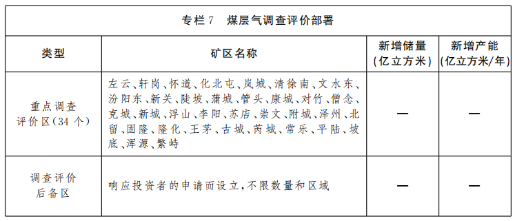 扩大煤层气重点调查评价区,适当投入政府地质勘查基金,开展基础性调查工作。设置煤层气重点调查评价区34个,其中位于国家规划矿区内6个、省规划矿区内13个、一般矿区15个。继续优选、实施好一批深部煤层气、新区域新层系煤层气资源调查评价项目,具备条件的矿区可公开出让,鼓励商业投资,适度开展风险勘查。