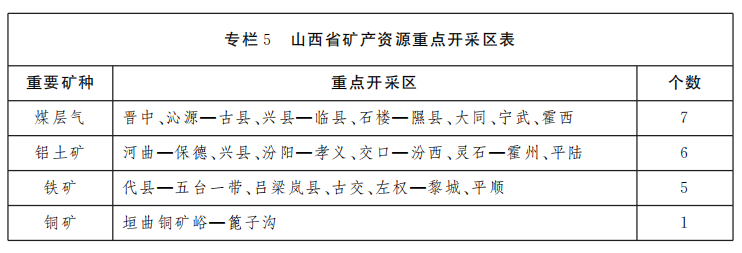 以铝、铁、铜、煤层气等矿种大中型矿产地集中分布区域为基础,结合产业发展需求以及拟出让采矿权情况综合划定,划定重点开采区19个,其中煤层气7个、铝土矿6个、铁矿5个、铜矿1个。