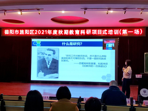 会上,旌阳区教育科研发展规划小组成员、德阳中学教师邓苗以“教育科学研究方法解读——以四川省教育科研资助金项目《义务教育教师课程领导力培养策略研究》为例”作专题培训。邓老师围绕教育科学研究原理解读了什么是教育科学研究、为什么要进行教育科学研究、如何展开教育科学研究等问题。结合课题实际,具体指导与会人员如何在教育科学研究工作中准备、实施和总结,有效提升了教师科研理论水平。