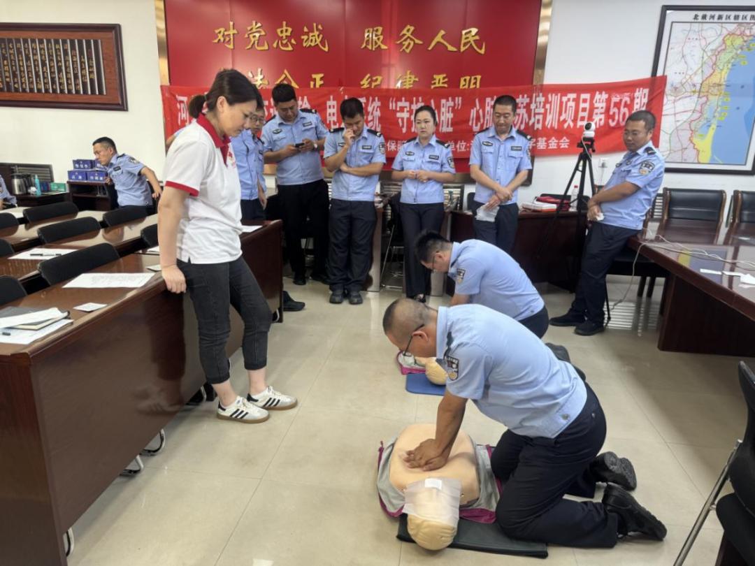 7月8日,北戴河新区红十字会在秦皇岛市公安局北戴河新区分局开展“守护心脏”心肺复苏(CPR+AED)急救技能培训活动。新区公安分局各部门以及各派出所各级民辅特警共50余人参加活动。