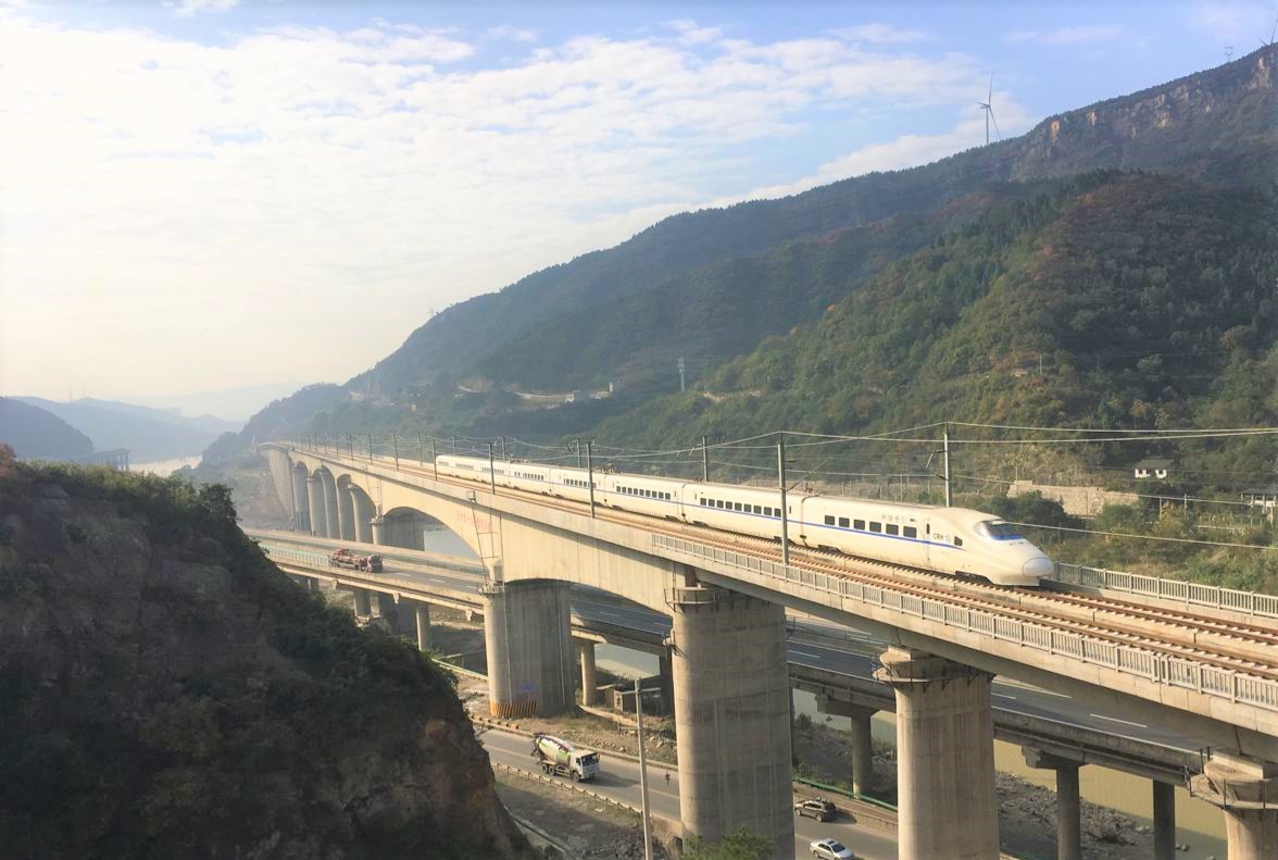 西成高铁自西安发出,一路穿越秦岭,经佛坪、洋县至汉中,经宁强过米仓山入川,由朝天经广元、青川至江油,与绵阳至乐山城际铁路相接,直达成都。其中需要穿越134公里长大密集隧道群,有45公里持续以25‰大坡度线路爬升,直接落差高达1100米,相当于动车在23分钟内以全速登上375层楼,创国内高铁之最,被誉为中国高铁“第一坡”。