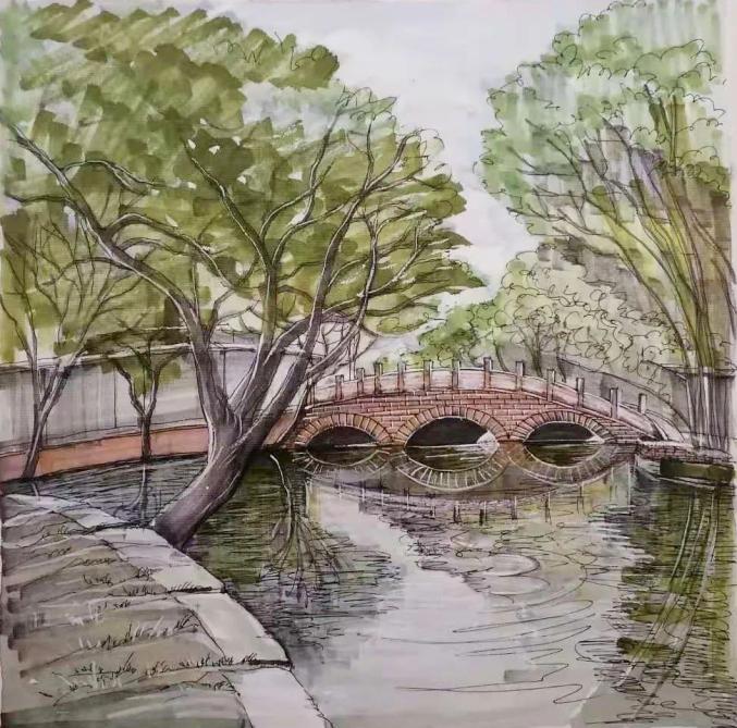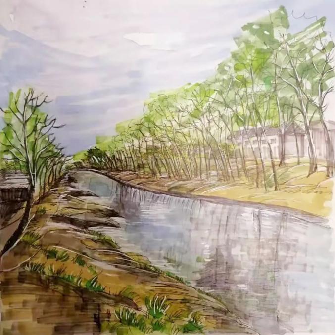 清流环绕,杨柳夹岸