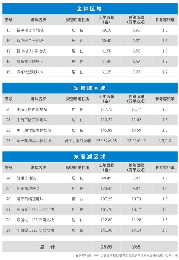 为更好推进产城融合,加快重点区域开发建设和城市更新,2023年东丽区将重点推介29宗居住和商服用地,可用地面积共计2526亩,涵盖区内万新、张贵庄、新立、金钟、军粮城、东丽湖六大区域。