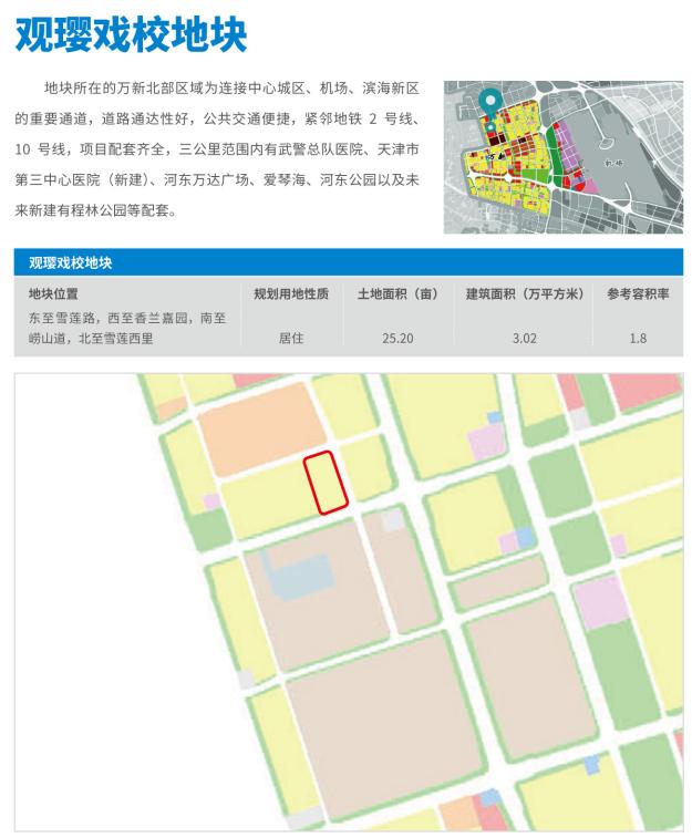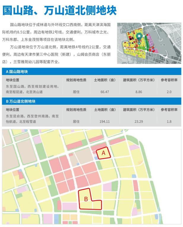 万新区域地处天津市中心城区,东南半环快速路、津滨大道、卫国道等交通干道贯穿辖区,地铁2号线、4号线、10号线等轨道交通交织成网,毗邻天津滨海国际机场。依托天津“设计之都”核心区和“新程林”地区开发建设,公共服务设施齐全、城市开放空间宜人。该区域重点推介观璎戏校地块、机场路地块、国山路地块、万山道北侧地块,07街坊、10街坊地块共计六宗地块,可用地面积427亩。