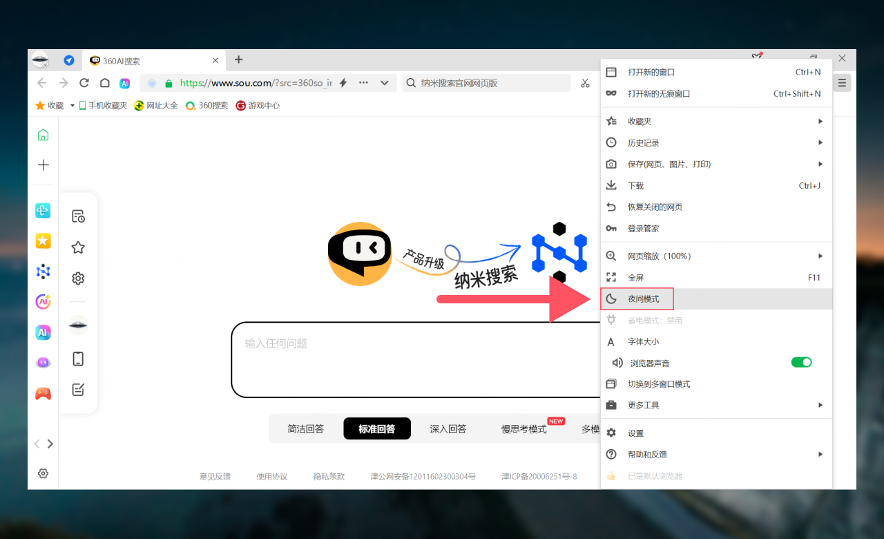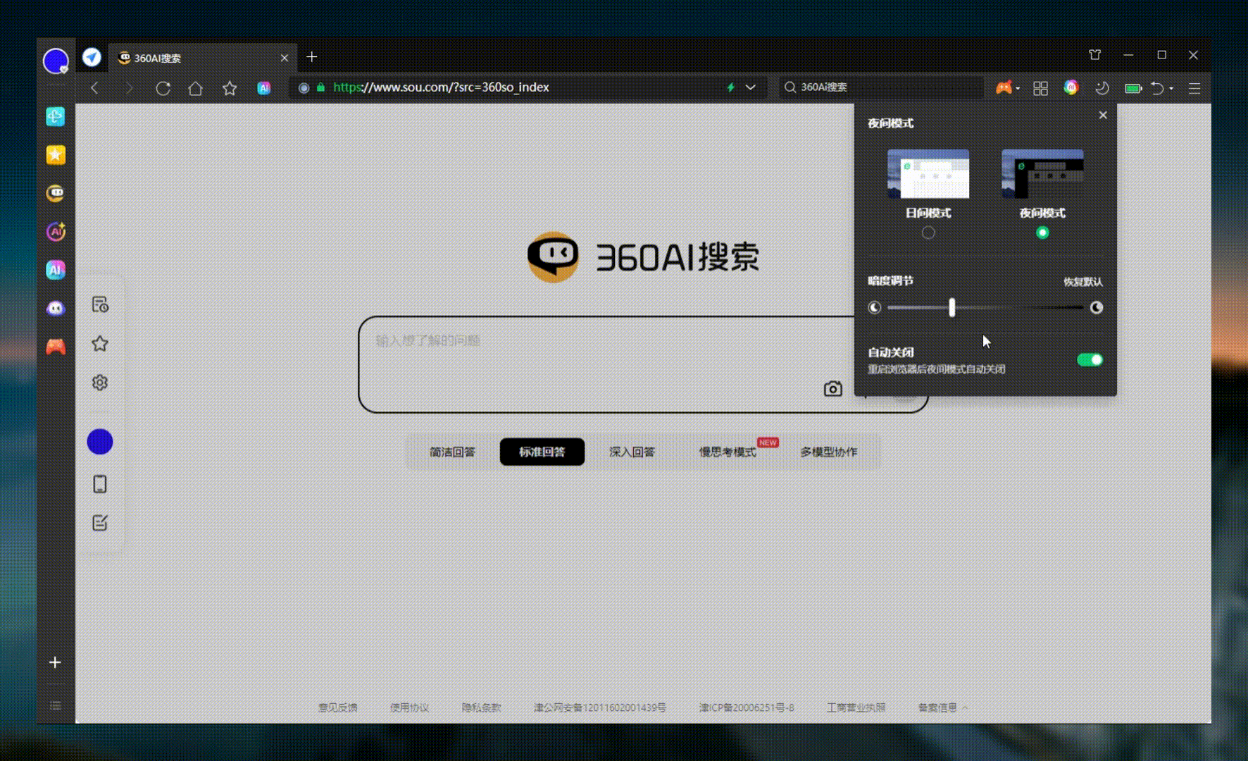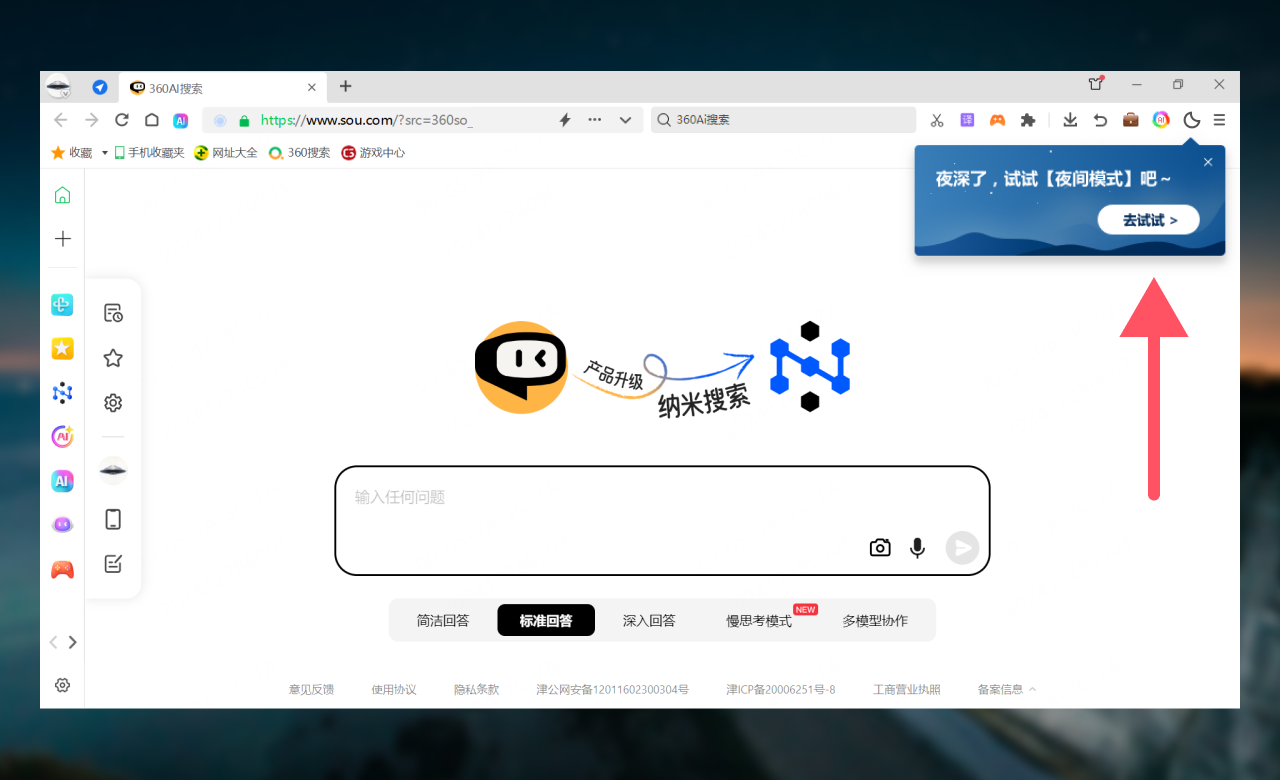 ➢ 当浏览器识别到你在晚上21:00-凌晨5:00之间还在使用浏览器,会自动出现弹窗,提示你「夜深了,试试夜间模式吧~」,点击即可打开设置面板。