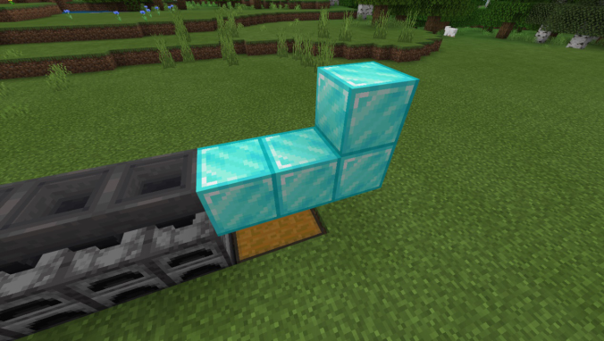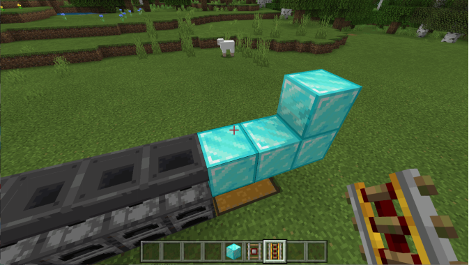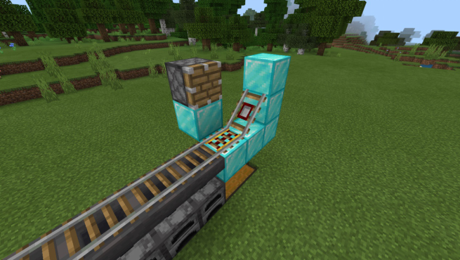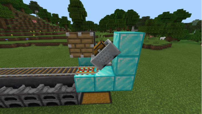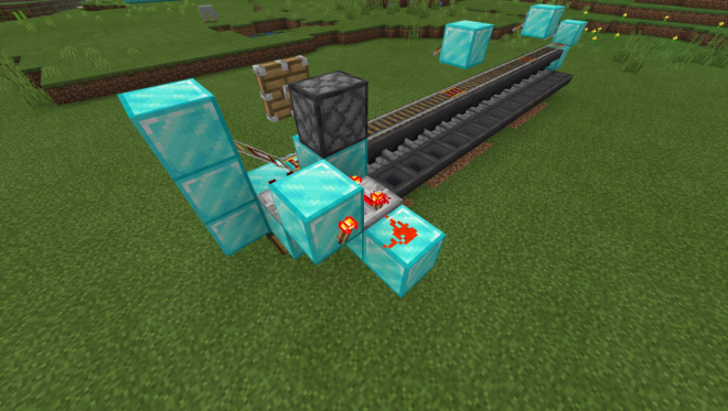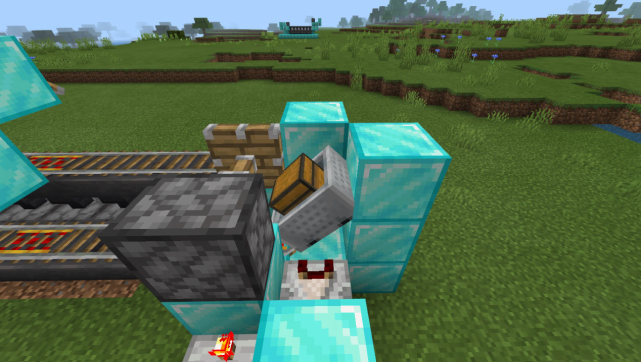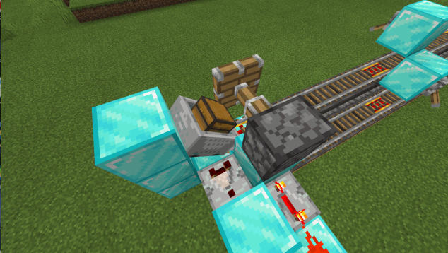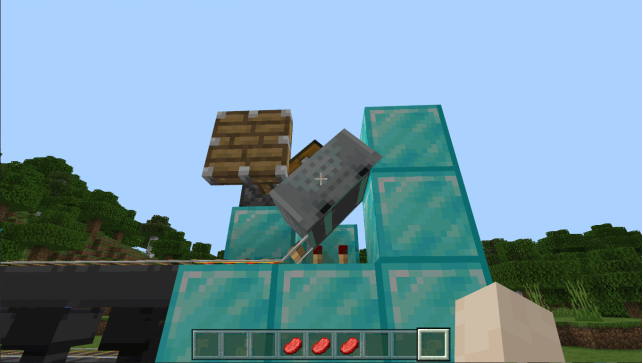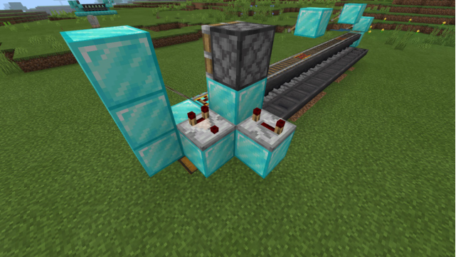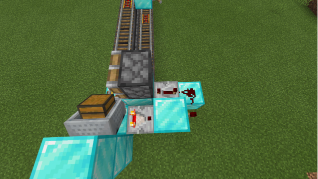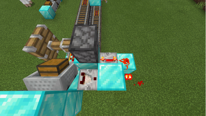 回到探测铁轨的一侧,在动力铁轨的后方放置一个普通方块和活塞,并如图放置红石比较器和一个满档的红石中继器