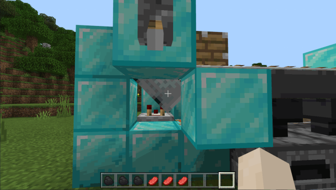 然后我们来到有箱子的那一端,在漏斗旁如图放置普通方块