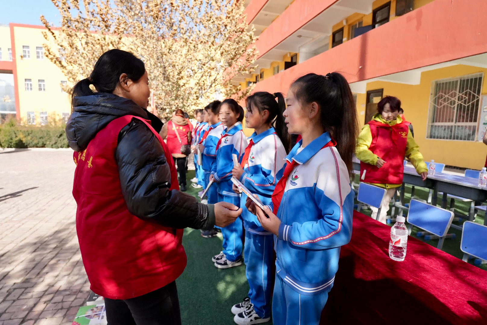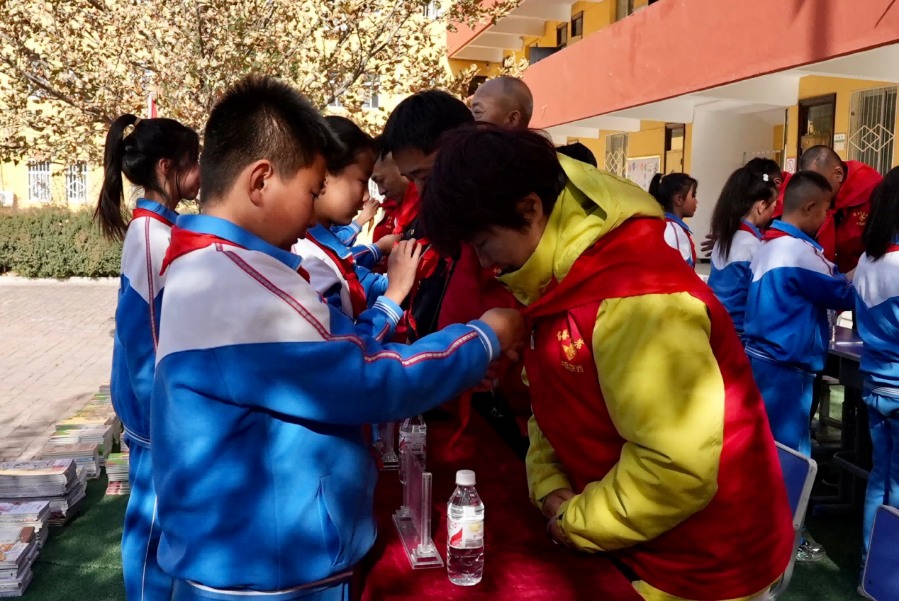 “我们多么希望能像城里的孩子们一样,在课余时间,自由自在地在书海里遨游……”学生代表宁紫愿诉说心愿。随后,少先队员依次上台,为志愿者代表佩戴红领巾、行队礼。