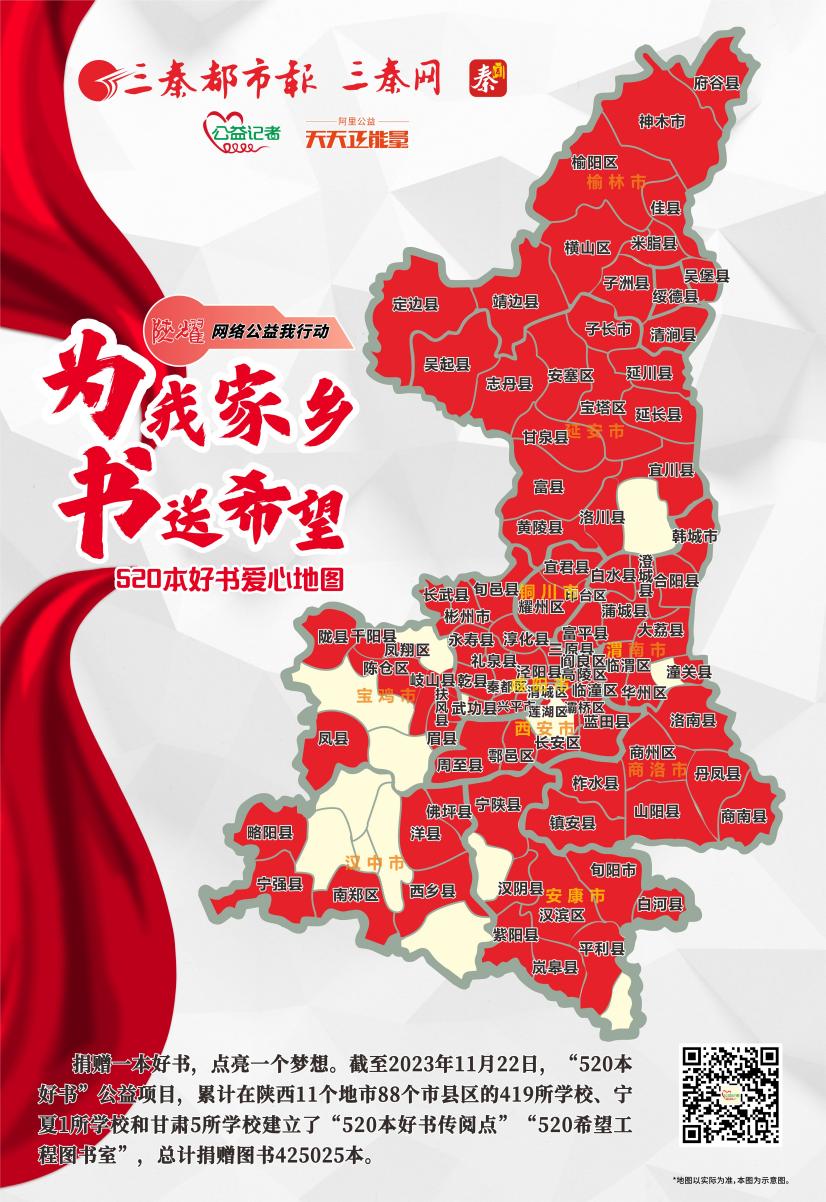 捐赠一本好书,点亮一个梦想!截至2023年11月22日,“520本好书”公益项目,累计在陕西11个地市88个市县区的419所学校、宁夏1所学校和甘肃5所学校建立了“520本好书传阅点”“520希望工程图书室”,总计捐赠图书425025本。