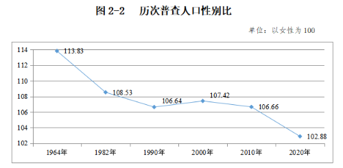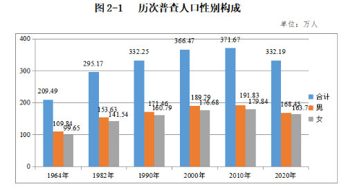 全市常住人口中,男性人口为1684526人,占50.71%;女性人口为1637327人,占49.29%。总人口性别比(以女性为100,男性对女性的比例)为102.88,与2010年第六次全国人口普查的106.66下降3.78个百分点。