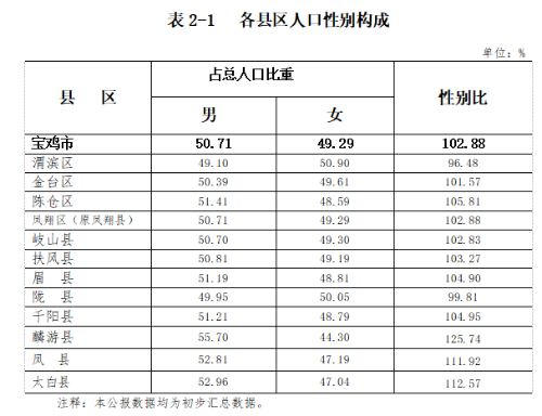 根据第七次全国人口普查结果,现将2020年11月1日零时我市12个县(区)的人口性别构成情况公布如下: