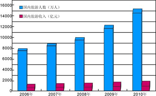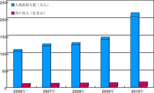 年份 入境旅游人数(万人) 外汇收入(亿美元) 国内旅游人数(万人) 国内旅游收入(亿元) 旅游总人数 (万人) 旅游总收入 (亿元) 2006 106.1 5.1 6950 378 7056.1 418.8 2007 123.1 6.1 8015 458 8138.1 504.1 2008 125.7 6.6 9056 561 9181.7 607 2009 145.1 7.7 11410 715 11555.1 767.9 2010 212.2 10.2 14354 916 14565.9 983.9 年均增长率 18% 17.8% 19.1% 23.7% 19.1% 22.7%